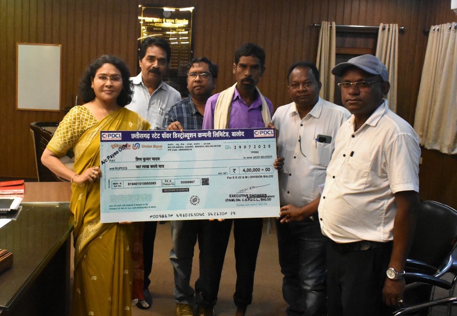 विद्युत विभाग के कार्यापालन अभियंता ने बताया कि जिले के गुरूर विकासखण्ड के ग्राम घोघोपुरी निवासी श्री फलेश्वर यादव 17 फरवरी 2025 को ग्राम सनौद में आयोजित शादी समारोह में बाजा बजाने आया था। विवाह कार्यक्रम के दौरान समारोह में लगाए गए टेंट मंे बिजली प्रवाहित होने पर वह टेंट में लगे लोहे के संपर्क में आने से फलेश्वर यादव की मृत्यु हो गयी थी। इस घटना के लिए छत्तीसगढ़ राज्य विद्युत वितरण कंपनी व राज्य सरकार द्वारा मुआवजे के प्रावधान के अनुसार मृतक के उत्तराधिकारी पिता श्री शिवकुमार यादव को चेक के माध्यम से 04 लाख रूपये का मुआवजा राशि प्रदान किया गया है।