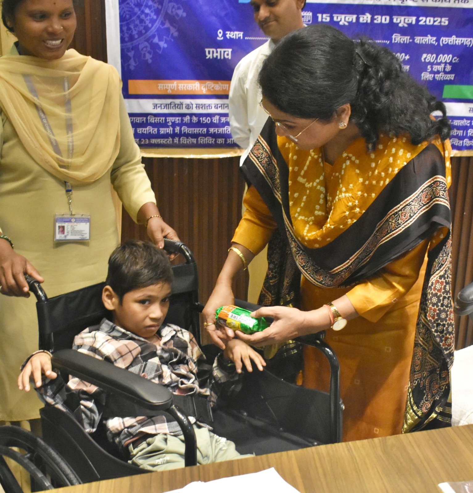 कलेक्टर श्रीमती मिश्रा ने जनदर्शन के दौरान नन्हे दिव्यांग ओजेश को व्हीचेयर प्रदान कर उन्हें शुभकामनाएं दी।