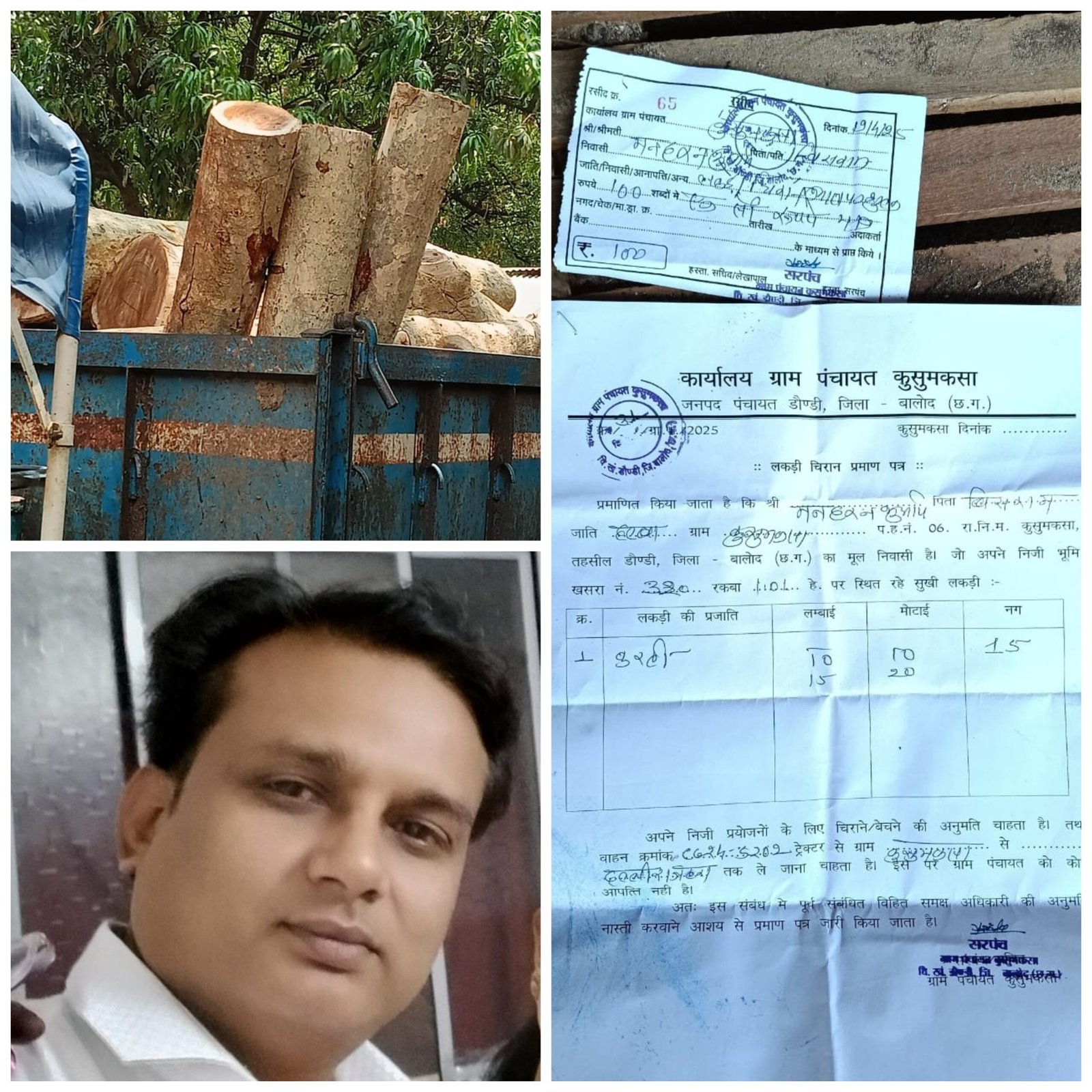 ग्राम पंचायत कुसुमकसा के सरपंच द्वारा कृषक मनहरण को जारी किए गए प्रमाण पत्र अनुसार किसान के निजी जमीन पर रहे सुखी करही प्रजाति की लकड़ी बेचने/चिराने की अनुमति सहित राजहरा तक परिवहन हेतु अनुमति दी गई है। उक्त प्रमाण पत्र में दिनांक का कोई उल्लेख नहीं है, वहीं प्रमाण पत्र हेतु सौ रुपए की एक रसीद भी काट कर दी गई है, जिसमें 19 अप्रैल की दिनांक अंकित है।