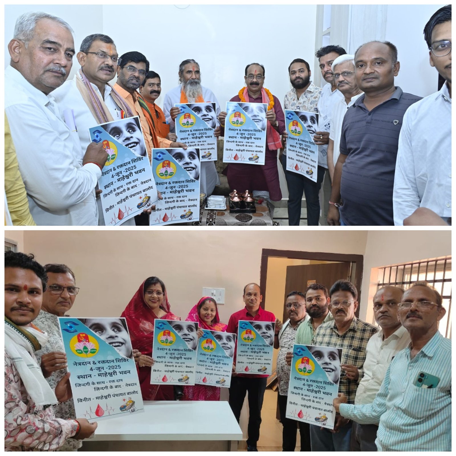बालोद: नगर में माहेश्वरी पंचायत द्वारा महेश नवमी 4 जून को नेत्रदान और रक्तदान शिविर का आयोजन किया जा रहा है। जिसके पोस्टर का विमोचन उपमुख्यमंत्री अरुण साव और संजारी बालोद विधायक संगीता सिन्हा ने किया और उपमुख्यमंत्री एवं विधायक को शिविर में आने आमंत्रित किया गया। साथ ही सर्व समाज को इस आयोजन में शामिल होने की अपील की गई। वही आयोजित नेत्रदान और रक्तदान शिविर के लिए विधायक संगीता सिन्हा द्वारा समाज को प्रोत्साहित भी किया गया।