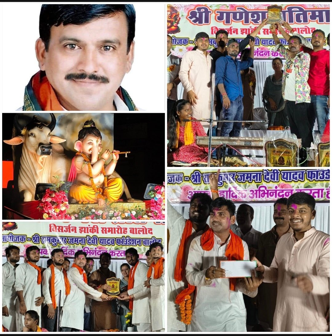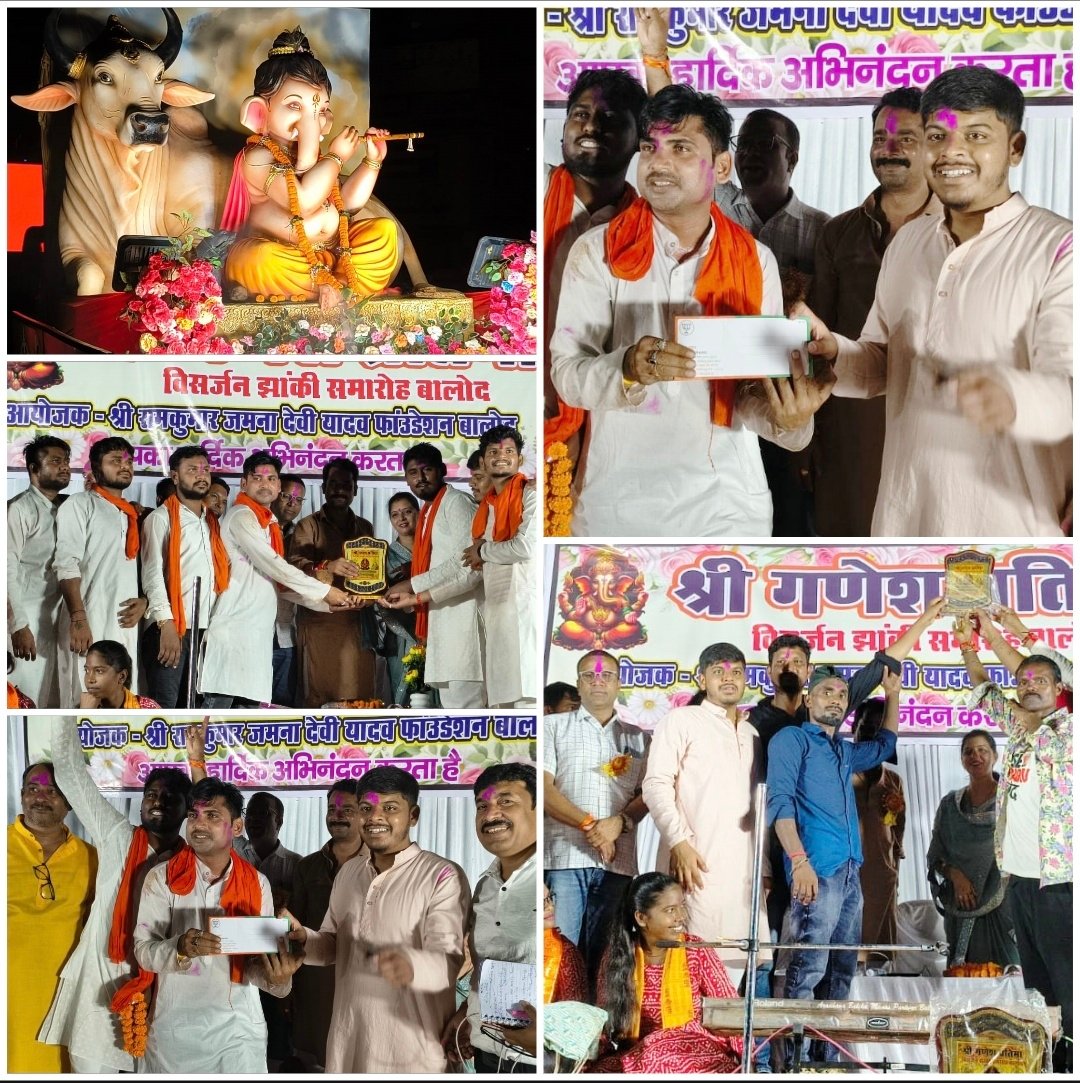 बालोद :- जिले के बालोद नगर में प्रति वर्ष की तरह इस वर्ष भी श्री गणेशोत्सव प्रतिमा विसर्जन झांकी कार्यक्रम मंगलवार को रात्रि 8 बजे से आयोजित किया गया इस अवसर पर रामकुमार जमनादेवी यादव फाउंडेशन सस्था के प्रमुख राकेश यादव द्वारा श्री गणेश प्रतिमा विसर्जन झांकियों को प्रोत्साहित करने तहसील कार्यालय के समीप भजन संध्या का कार्यक्रम आयोजित किया गया जिसमें सभी प्रतिमाओं के समिति प्रमुखों को प्रोत्साहित करते हुए नगद 3100/ राशि,शील्ड व श्रीफल भेंटकर सम्मानित किया गया।