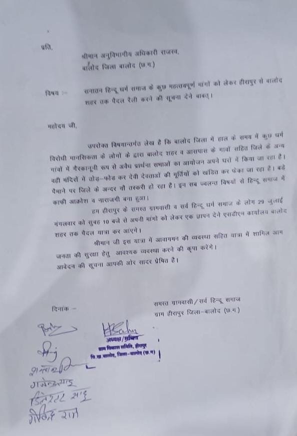 ग्राम हीरापुर के अध्यक्ष ग्राम विकास समिति हेमंत साहू. कुशल ठाकुर. रमेश निषाद. हेमराज साहू.खिलावन निषाद. शंतानु निषाद. कुबेर निषाद.परमानंद साहू.बिहारी यादव.कुंजलाल साहू .संतराम साहू ने बताया कि बालोद जिला के हीरापुर गांव सहित अन्य स्थानों पर ईसाई मिशनरियों व कुछ धर्मांतरित हिंदू जो अपने आप को ईसाई धर्म के प्रति विश्वासी बताते है। इनके द्वारा गांव में लंबे समय से अपने घरों मे एकत्र होकर अन्य बाहर से लोगो को बुलाकर प्रार्थना सभा की आड़ में हिंदू विरोधी कार्य किये जा रहे है।