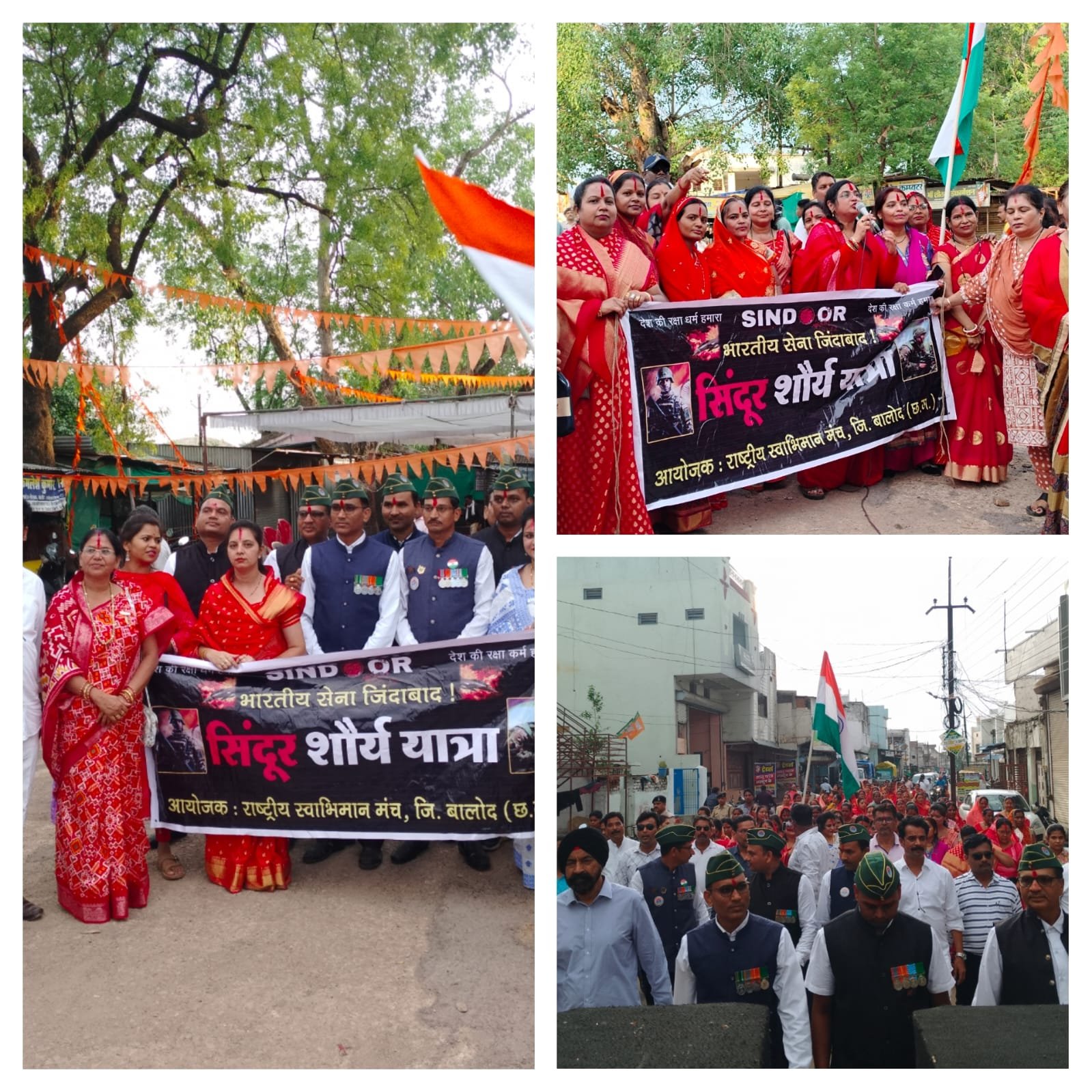 जिसमें मुख्यवक्ता के तौर पर बाल संरक्षण आयोग की अध्यक्ष वर्णिका शर्मा बालोद नपाध्यक्ष प्रतिभा चौधरी महिला नेत्री ममता साहू थी इस अवसर पर शहर के पुर्व सैनिक गणमान्य नागरिकों जनप्रतिनिधियो की उपस्थिति में सैकड़ो महिलाओ ने अपनी मांगों पर सिंदूर भरकर रैली निकाली जो शहर के प्रमुख मार्गों से होकर जय स्तम्भ चौक पहुंची जहां मुख्यवक्ता वर्णिका शर्मा ने अपनी ओजस्वी भाषण से महिलाओ में जोश भर दिया उन्होंने अपने उद्बोधन में कहा कि भारत का अभिन्न अंग जम्मू कश्मीर पूरी दुनिया मे खूबसूरती के लिए जाता है यहां पिछले कुछ सालों में शांति अमन चैन था यहां सैलानी भी अधिक मात्रा में आ रहे थे ।