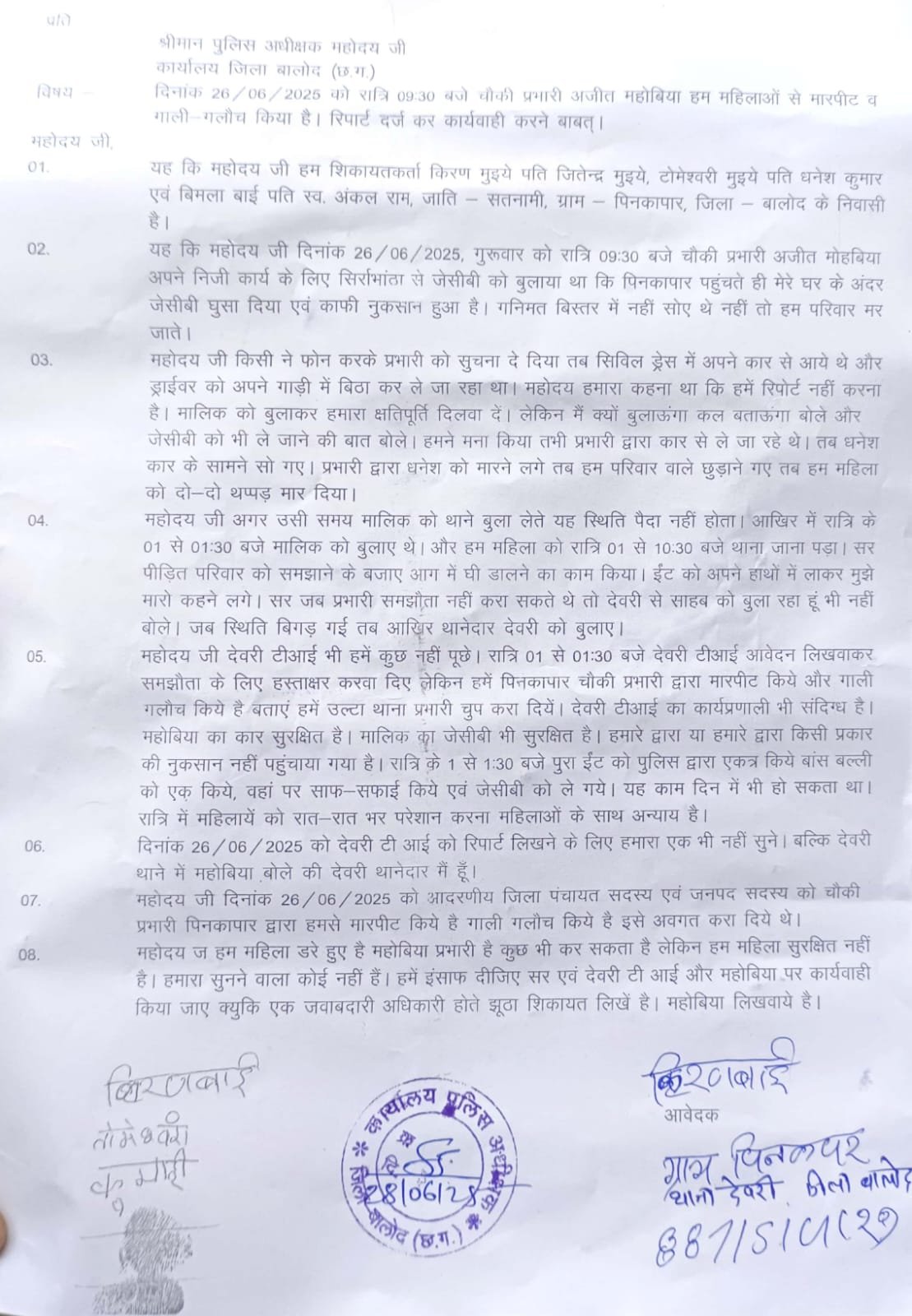वही महिलाओं का कहना है कि जब उन्होंने मौखिक क्षतिपूर्ति की बात कही तो प्रभारी ने उन्हें थप्पड़ मारा और रात भर थाने में बैठाकर मानसिक रूप से प्रताड़ित किया गया। देवरी टीआई पर भी गंभीर आरोप लगाए गए हैं कि उन्होंने पीड़ित पक्ष की शिकायत सुने बिना सिर्फ समझौते पर हस्ताक्षर करवा लिए और इसके बाद एकतरफा कार्यवाही करते हुए जितेन्द्र एवं धनेश सतनामी को आरोपी बनाकर जेल भेज दिया गया।जिसको लेकर दोनो आरोपियों की पत्नी और मां तथा उनके बच्चे शनिवार को बालोद एसपी कार्यालय पहुंचे।पीड़ित पीड़ित परिवार के लोगो द्वारा रोते बिलखते हुए बालोद एसपी को मामले पर लिखित शिकायत करने पहुंचे और अपने ऊपर हुए इस गलत हुए कार्यवाही पर पीड़ित परिवार ने जिला पुलिस अधीक्षक से निष्पक्ष जांच और दोनों अधिकारियों पर कार्रवाई की मांग की है। अब देखना होगा कि क्या प्रशासन इस मामले में महिलाओं की पुकार सुन पाएगा या नहीं।