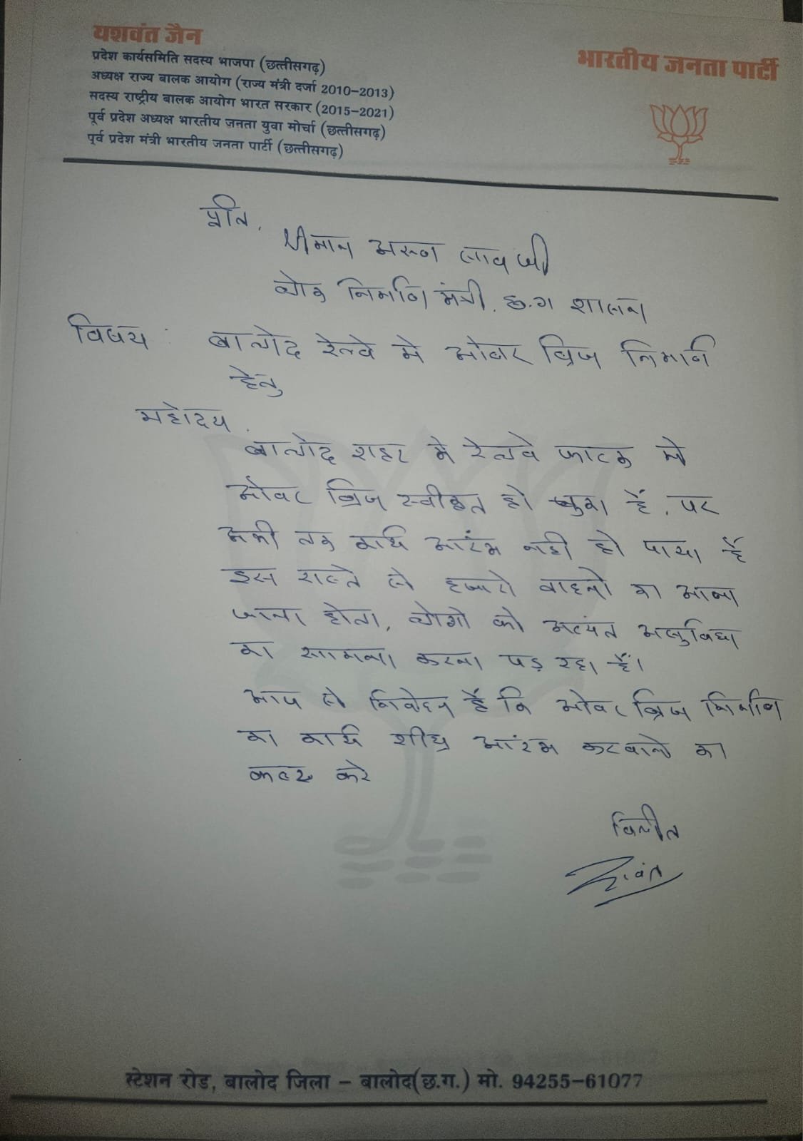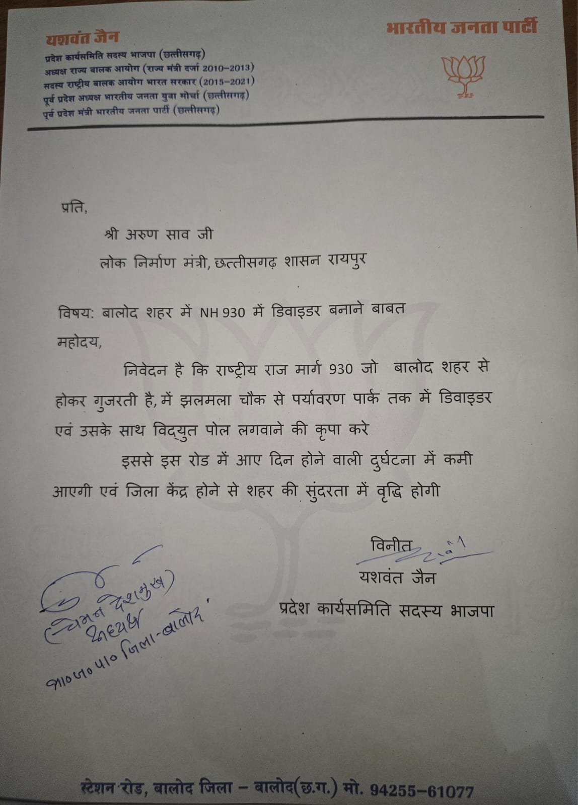 जिला अध्यक्ष चेमन देशमुख और यशवंत जैन ने नगरी प्रशासन मंत्री से मुलाकात कर यशवंत जैन के लेटर पैड पर दोनों ने हस्ताक्षर कर एक पत्र सौंपा। पत्र के माध्यम से दोनों ने मंत्री के समक्ष मांग रखी की झलमला चौंक से पर्यावरण पार्क तक बने राष्ट्रीय राजमार्ग 930 में विद्युत पोल के साथ डिवाइडर का निर्माण किया जाए। ताकि हादसों पर लगाम लगे और शहर की सुंदरता भी बढ़े।