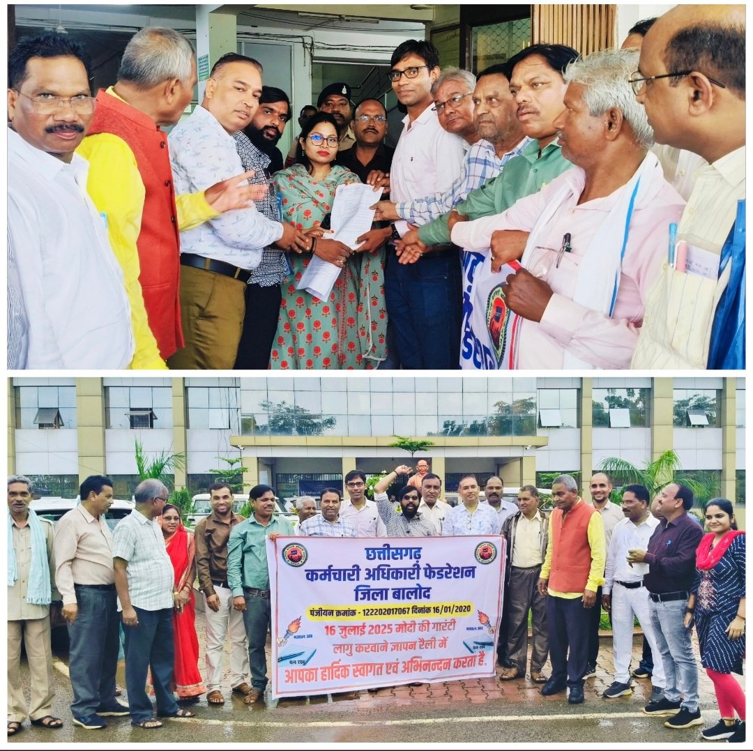 बालोद :- छत्तीसगढ़ कर्मचारी अधिकारी फेडरेशन के आह्वान पर पूरे बालोद जिले मे कर्मचारी व अधिकारी मोदी की गारंटी लागू करवाने की मांग व 11 सूत्रीय मांगों को लेकर आज 16 जुलाई को मुख्यमंत्री के नाम पर कलेक्टर बालोद को ज्ञापन सौंप कर व रैली निकाल कर प्रदर्शन किया गया।