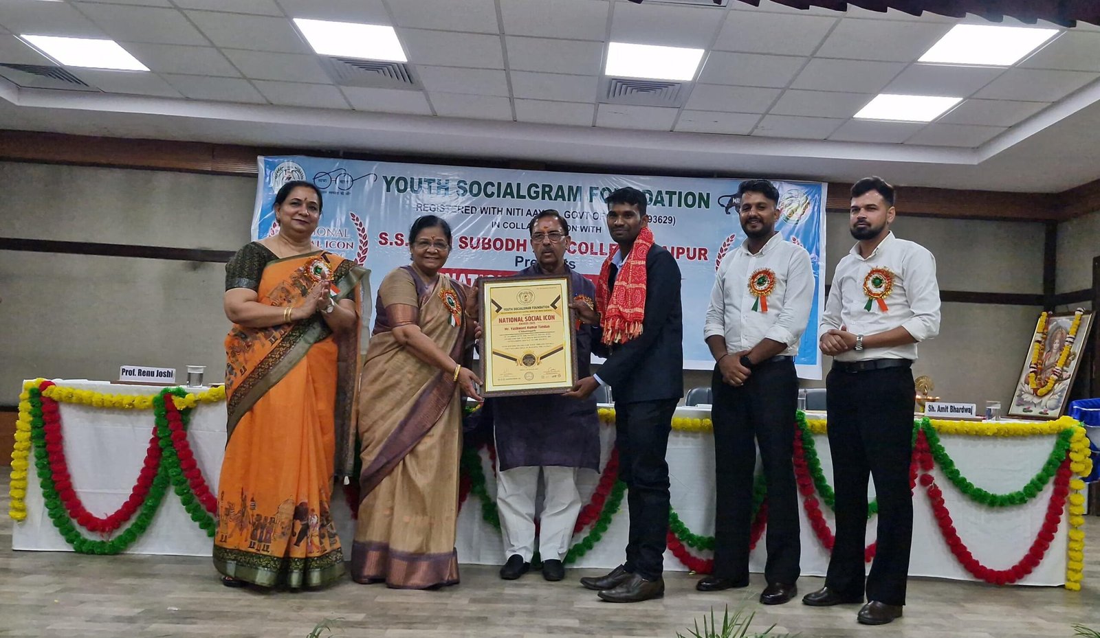 यह भव्य समारोह यूथ सोशलग्राम फाउंडेशन के चौथे स्थापना दिवस के अवसर पर शुक्रवार, 29 अगस्त 2025 को एस.एस. जैन सुबोध पीजी कॉलेज, जयपुर में आयोजित हुआ। समारोह में डॉ. अरुण चतुर्वेदी (राज्यमंत्री, वित्त आयोग, राजस्थान सरकार) और श्रीमती मंजू शर्मा (सांसद, जयपुर) मुख्य अतिथि के रूप में उपस्थित रहे। इस अवसर पर कॉलेज की प्राचार्या प्रो. रेनू जोशी ने भी मंच साझा करते हुए विजेताओं का उत्साहवर्धन किया और कहा कि ऐसे कार्यक्रम न केवल छात्रों को बल्कि पूरे समाज को सामाजिक उत्तरदायित्व निभाने के लिए प्रेरित करते हैं। समारोह का संचालन यूथ सोशलग्राम फाउंडेशन के संस्थापक योगेश चौधरी और सह-संस्थापक अमित भारद्वाज ओर कार्यक्रम आयोजन समिति के अध्यक्ष डॉ. विशाल गौतम ने किया। संस्थापक ने अपने उद्बोधन में कहा कि “हमारा उद्देश्य युवाओं को समाज की मुख्यधारा से जोड़ना है, ताकि वे परिवर्तन के वाहक बन सकें। चार वर्षों में यह संगठन देशभर में हजारों युवाओं तक पहुँचा है और अब यह एक राष्ट्रीय स्तर का आंदोलन बन चुका है। नेशनल सोशल आइकॉन अवॉर्ड हर वर्ष उन समाजसेवियों को दिया जाता है जिन्होंने शिक्षा, स्वास्थ्य, महिला सशक्तिकरण, पर्यावरण, युवा नेतृत्व और सामाजिक नवाचार के क्षेत्रों में उल्लेखनीय योगदान दिया हो। यह अवॉर्ड केवल 15 लोगों को ही प्रदान किया जाता है, जो इसकी प्रतिष्ठा और विशिष्टता को दर्शाता है। सम्मान प्राप्त कर भावुक यशवंत कुमार टंडन ने कहा यह अवॉर्ड सिर्फ मेरा नहीं, बल्कि छत्तीसगढ़ की मिट्टी और वहाँ के हर युवा का है। मैं मानता हूँ कि बदलाव लाने के लिए किसी बड़े पद या संसाधन की नहीं, बल्कि सच्ची नीयत और समर्पण की आवश्यकता होती है। यह सम्मान मुझे और अधिक निष्ठा से समाजसेवा करने की प्रेरणा देगा। समारोह में उपस्थित अतिथियों और दर्शकों ने तालियों की गड़गड़ाहट से उनका स्वागत किया। यशवंत कुमार टंडन की इस उपलब्धि पर छत्तीसगढ़ के सामाजिक संगठनों और युवाओं में खुशी की लहर है। यह सम्मान न केवल व्यक्तिगत उपलब्धि है बल्कि छत्तीसगढ़ राज्य की बढ़ती सामाजिक चेतना और सक्रिय युवाओं की पहचान भी है। कार्यक्रम के अंत में मुख्य अतिथि डॉ. अरुण चतुर्वेदी और सांसद मंजू शर्मा ने कहा कि ऐसे पुरस्कार युवा पीढ़ी को समाज की मुख्यधारा में सकारात्मक योगदान देने के लिए प्रेरित करते हैं। यशवंत कुमार टंडन जैसे युवाओं का प्रयास भारत को सशक्त और जागरूक समाज की ओर ले जा रहा है।
