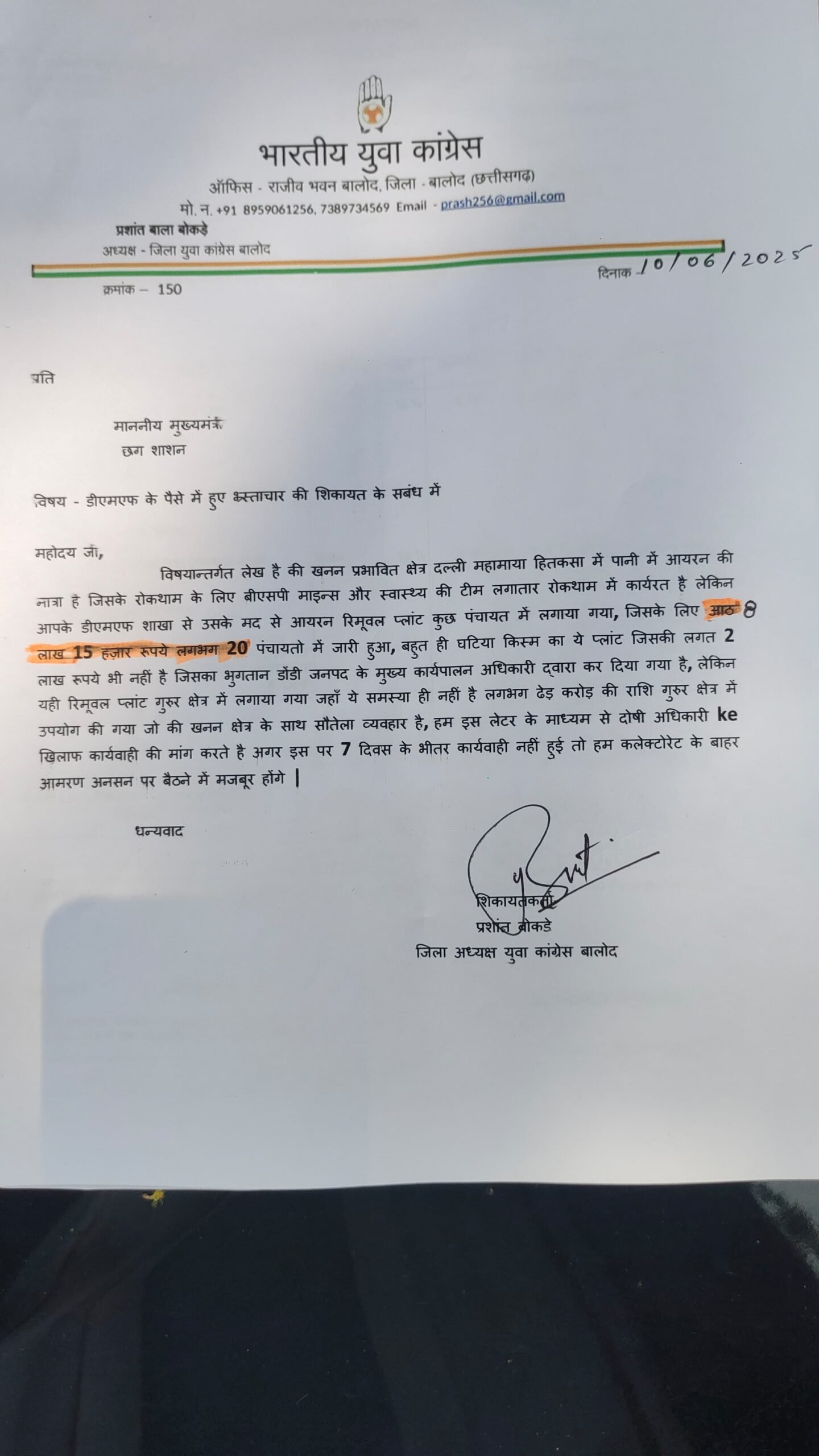 बालोद जिले में  लगातार हो रहे डीएमएफ फंड राशि की दुरुपयोग जिसकी शिकायत को लेकर युवा कांग्रेस अध्यक्ष प्रशांत बोकडे  ने जनदर्शन में सौपा ज्ञापन  समास्याओं का निराकारण नही होने पर जिला क्लेट्रेड के सामने भुख हड़ताल पर बैठने की दी चेतावनी